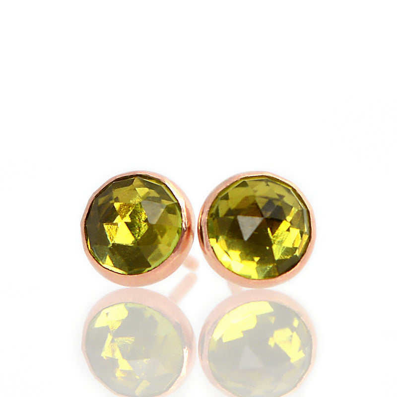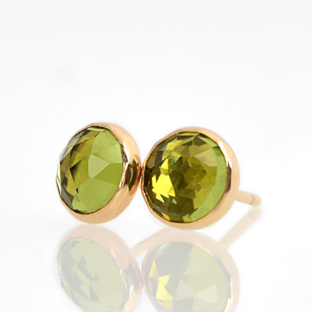 Natural Peridot Stud Earrings feature Rose Cut Peridot cabochons set in 14k Gold. Great for everyday wear.