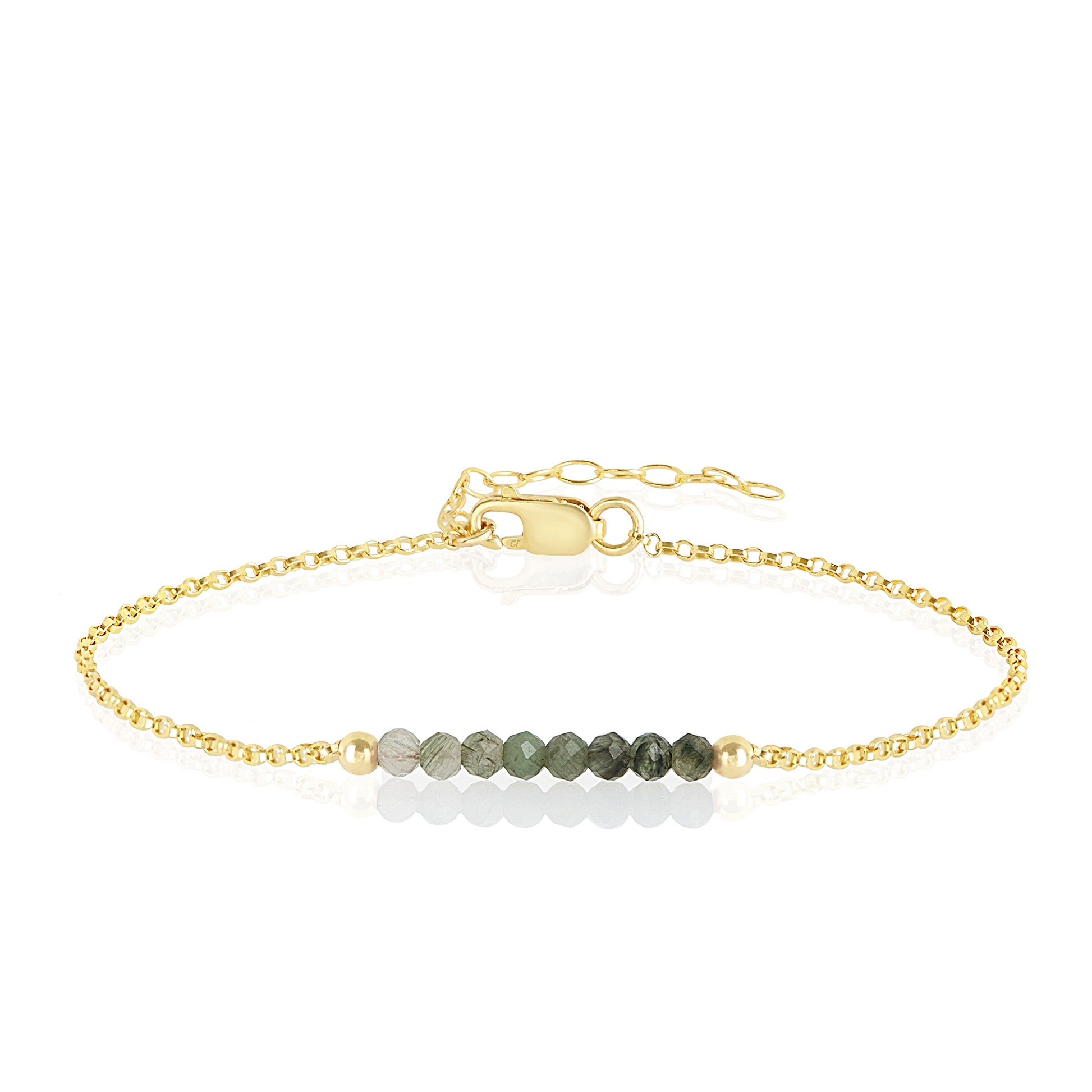 The delicate birthstone bracelet features a row of natural Moss Agate stones with two silver beads from both sides, flawlessly centered on a sturdy rolo chain. The adjustable length and the initials make this bracelet an exceptional gift.