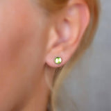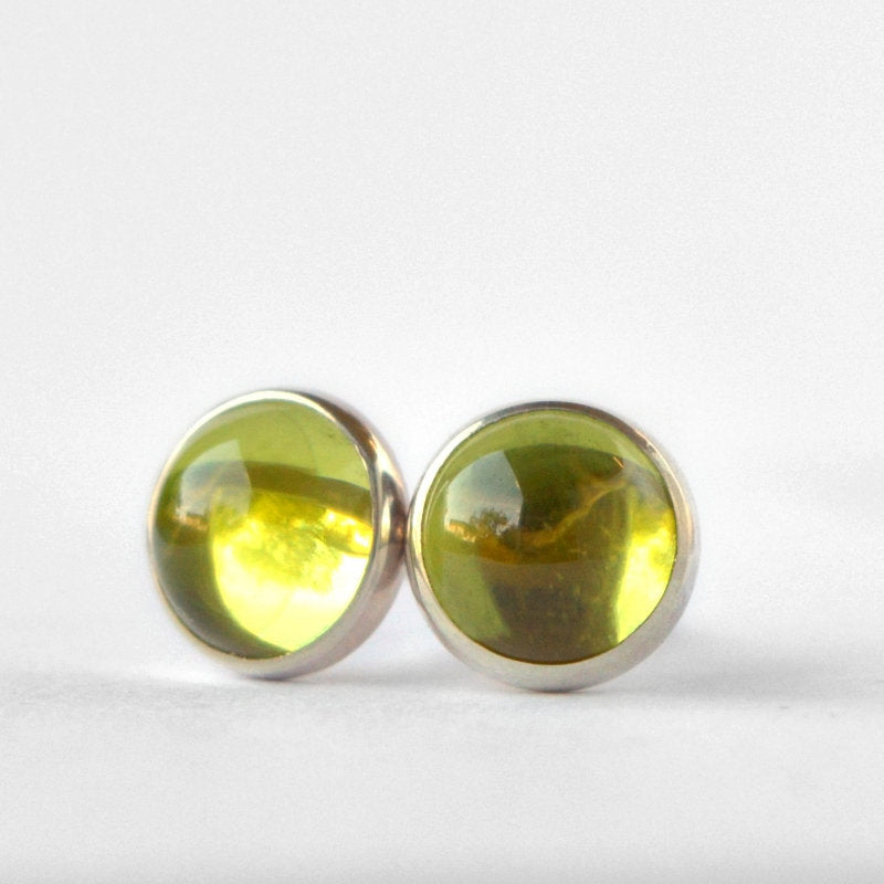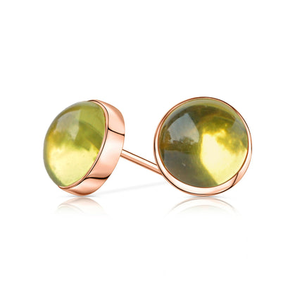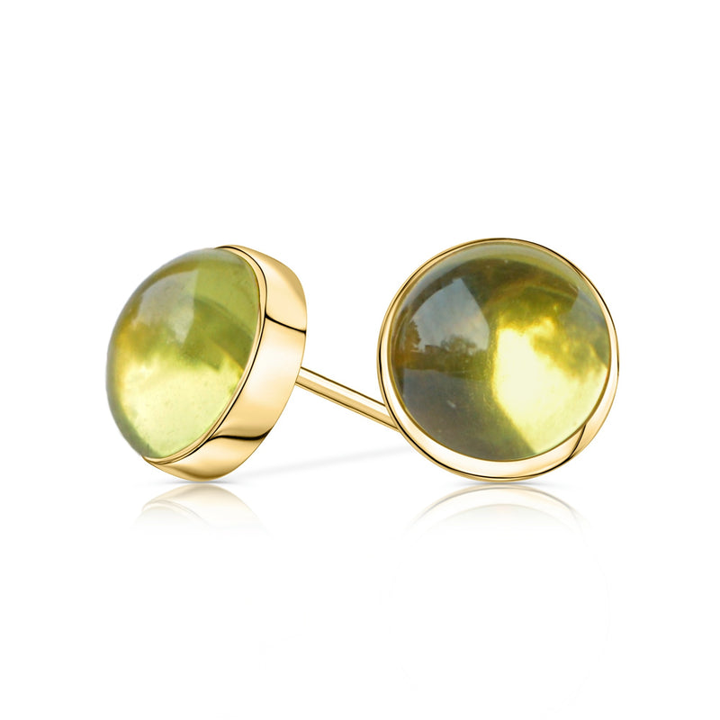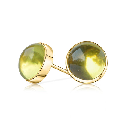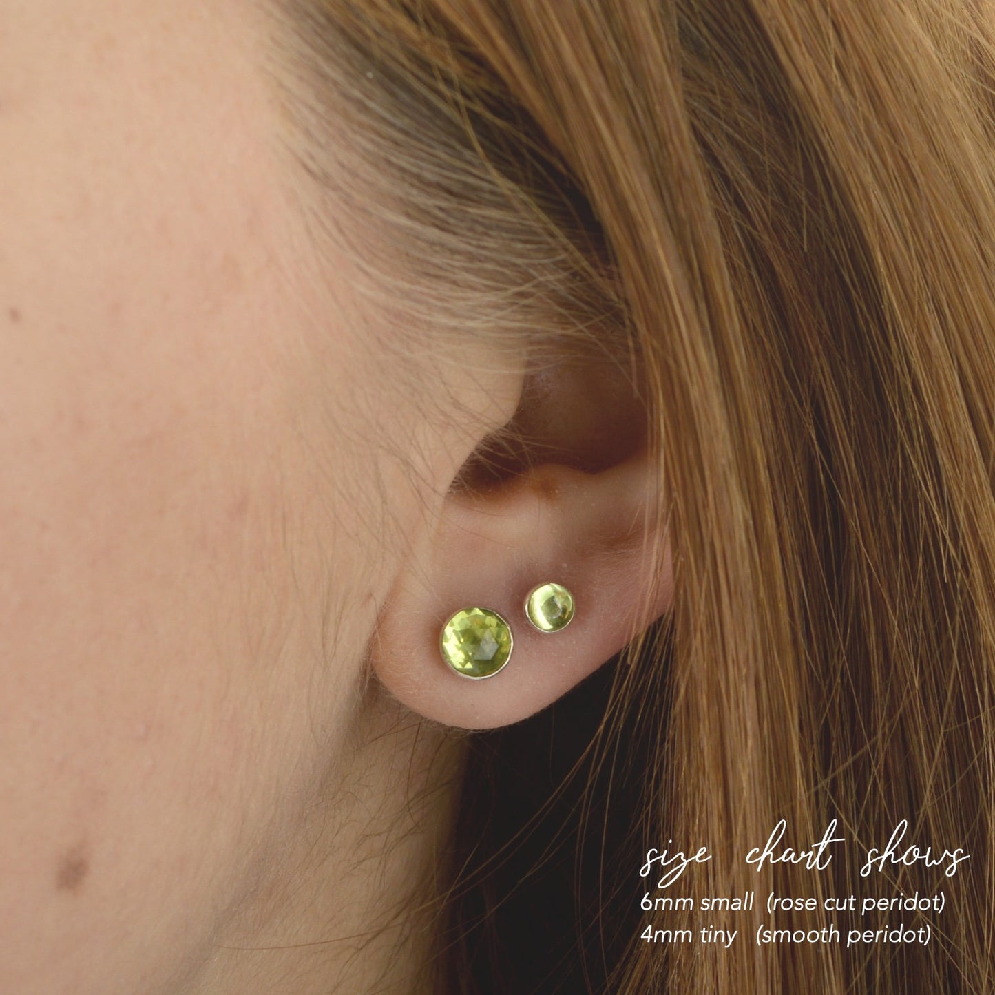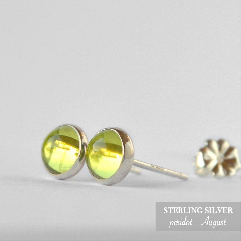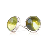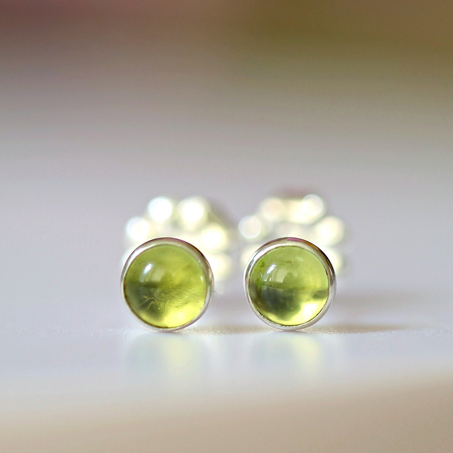 Natural Peridot Stud Earrings feature smooth Peridot cabochons bezel set in 14k Gold or Sterling Silver. Great for everyday wear.